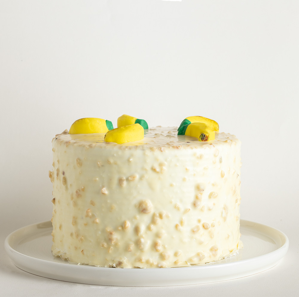 Taze muz dilimleriyle süslenmiş kremalı pasta.